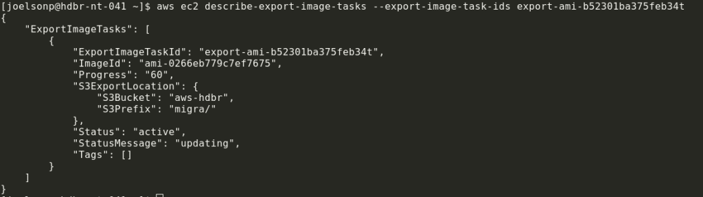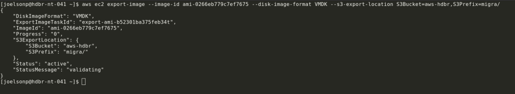 aws ec2 export-image --image-id ami-0266eb779c7ef7675 --disk-image-format raw --s3-export-location S3Bucket=aws-hdbr,S3Prefix=migra-hdbr/