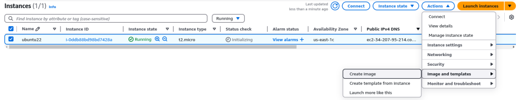 Para a criação da AMI, você deve selecionar a VM desejada, clicar em “Actions” > “Image and templates” > Criate Image: