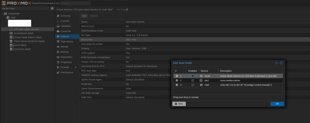 Após atachar será necessário ajustar a ordem de boot, habilitando o disco e configurando como primeira opção de boot: