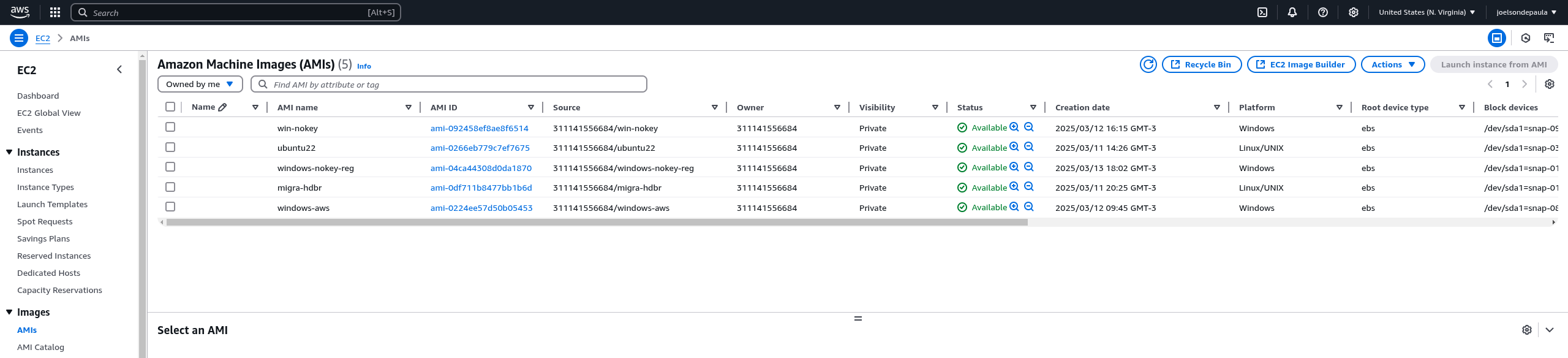 O procedimento de criação de AMI pode levar alguns minutos, levando em consideração o tamanho do volume. Ao ser finalizada a criação, a AMI ficará disponível na página de AMIs da AWS.